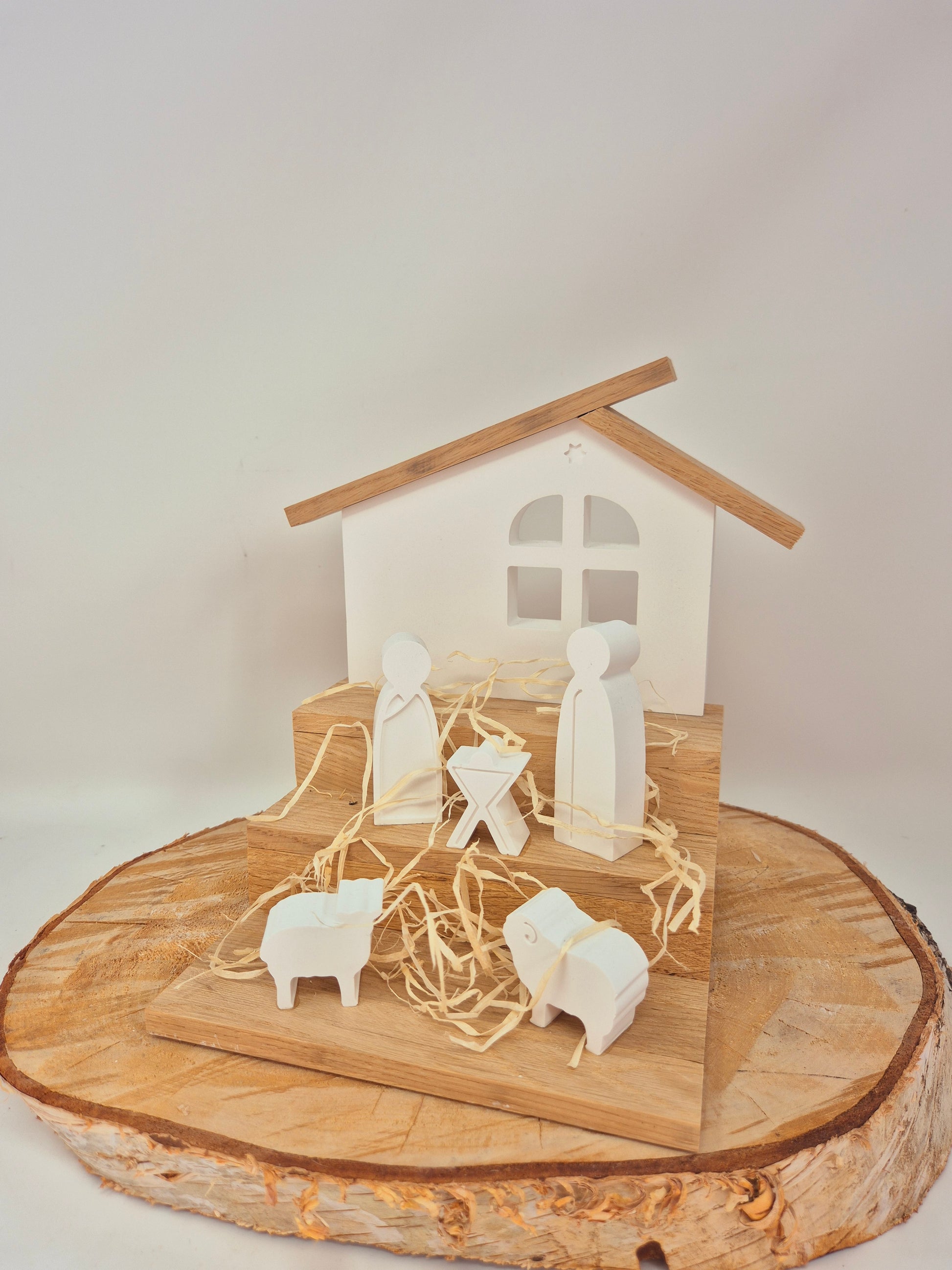 Die Krippe ist mit sorgfältig handgefertigten Figuren ausgestattet, die die zentrale Szene der Geburt Christi darstellen. Jede Figur ist mit viel Liebe zum Detail gestaltet, wodurch sie eine warme und einladende Ausstrahlung erhält. Die Kombination aus robustem Holz und dem feinen Keraflott verleiht der Krippe eine natürliche und rustikale Note, die sich harmonisch in jede Weihnachtsdekoration einfügt.