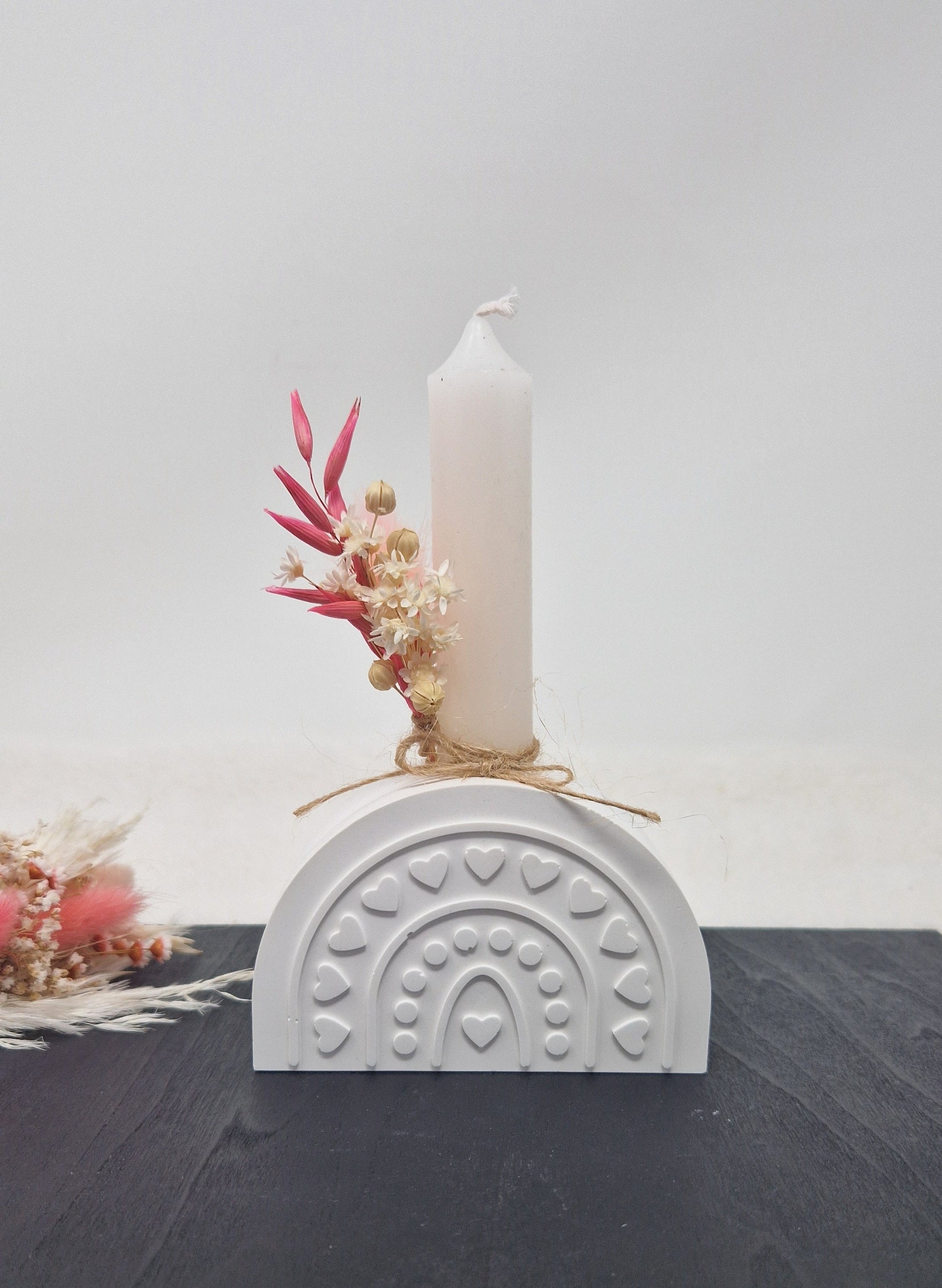 Dieser dekorative weiße Kerzenständer in Form eines Regenbogens ist einzigartig handgefertigt und mit einem Herzchendekor verziert. Er ist ein schöner Hingucker auf jedem Sideboard oder Tisch und passt zu jeder Jahreszeit und Anlass. Eine perfekte Ergänzung zu einem Geschenk oder eine tolle Dekoration für eine Taufe, Kommunion oder Geburtstagstafel.