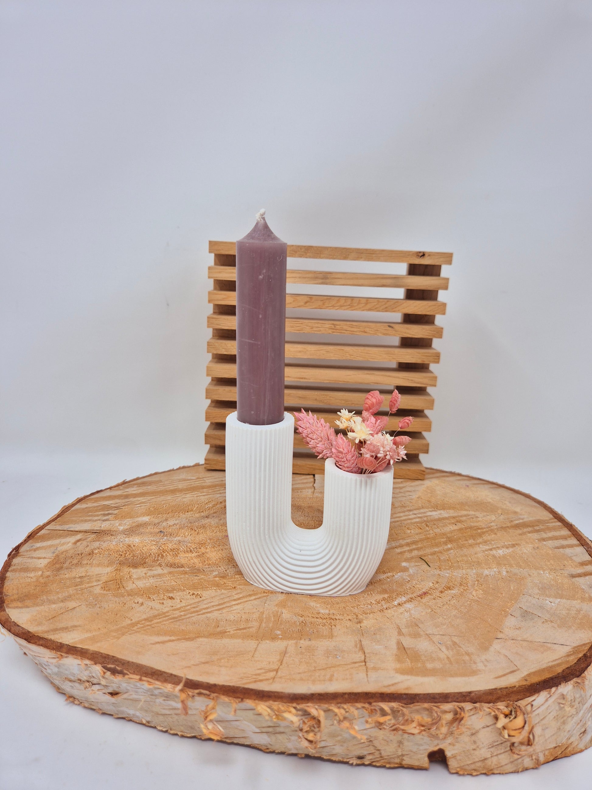 U-Vase aus Reliefgießmasse mit Trockenblumen und Kerze in Schlamm