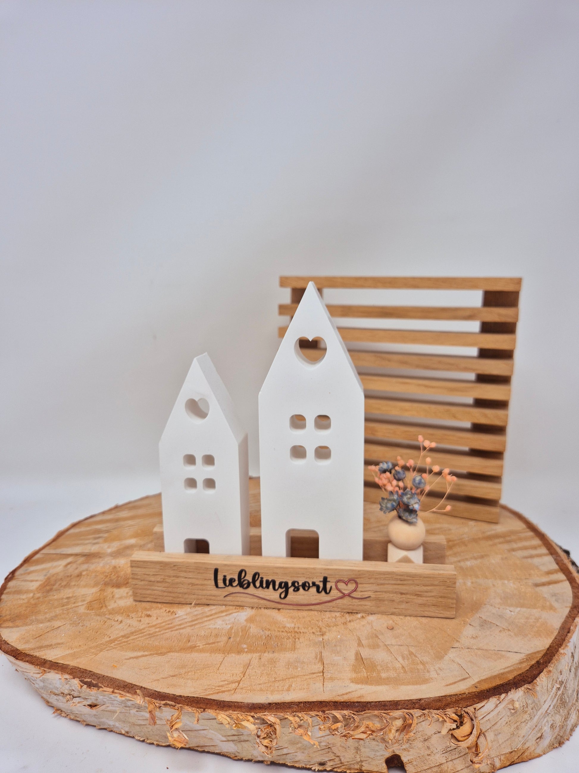 Zwei Häuser aus Keraflott auf einem Brett mit Trockenblumen